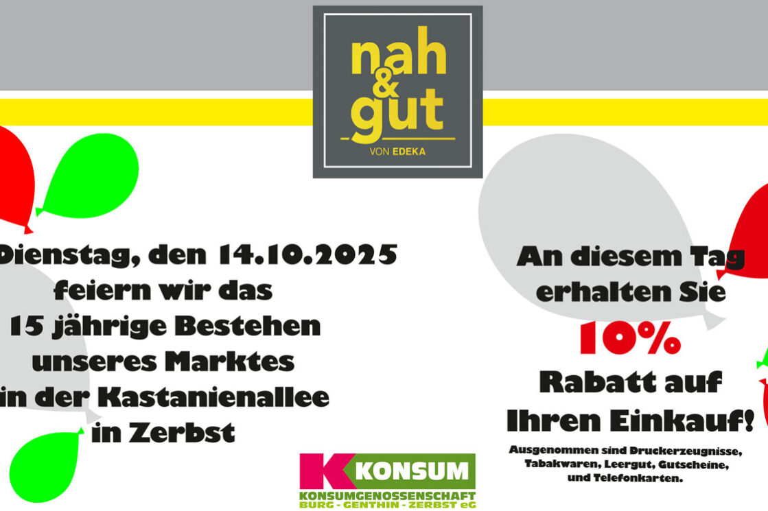 Wir haben Jubiläum ! 15 jähriges Bestehen unseres Marktes in der Kastanienallee in Zerbst. Das feiern wir mit Ihnen. Am 14.10.2025 erhalten Sie 10% Rabatt auf Ihren Einkauf.