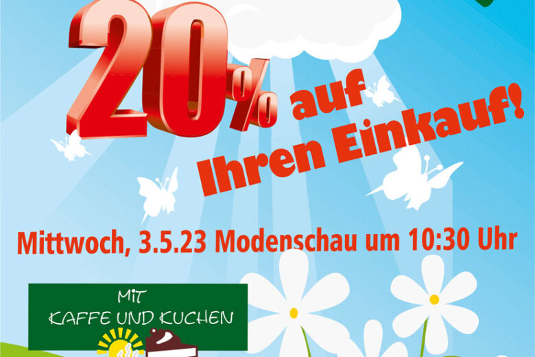 Am 3.05. Start in den Frühling im Kaufhaus Gommern 20% auf Ihren Einkauf! Mittwoch, 03.05.2023 Modenschau um 10:30 Uhr
