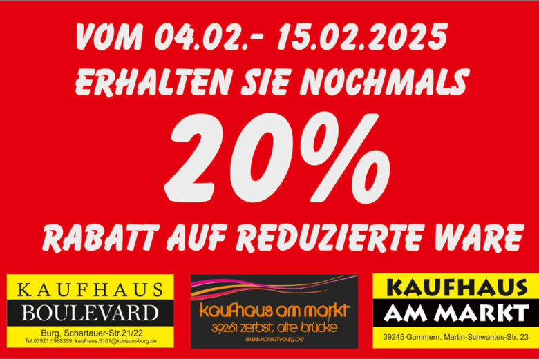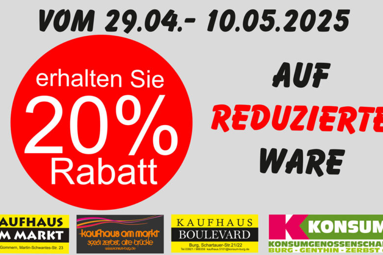 Sparfüchse aufgepasst! Vom 29.04.- 10.05.2025 erhalten Sie in unseren Kaufhäusern Burg, Gommern und Zerbst 20% Rabatt auf reduzierte Ware.
