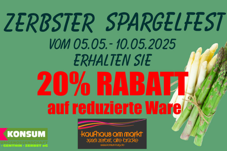 Spargelfest Zerbst Zum traditionellen Spargelfest in Zerbst laden wir Sie herzlich in unser Kaufhaus ein. Sie erhalten vom 05.05.- 10.05.2025 20% Rabatt auf reduzierte Ware.