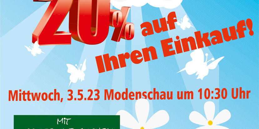 Am 3.05. Start in den Frühling im Kaufhaus Gommern 20% auf Ihren Einkauf! Mittwoch, 03.05.2023 Modenschau um 10:30 Uhr 26.04.2023KommentarnavigationZurückVorheriger Beitrag:Spargelfest in Zerbst mit 20% RabattNächstesNächster Beitrag:Neueröffnung nah & gut Markt Zerbst Fischmarkt